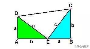 以a、b为直角边,以c为斜边作两个全等的直角三角形,则每个直角三角形的面积等于二分之一ab。把这两个直角三角形拼成如图所示形状,使A、E、B三点在一条直线上.