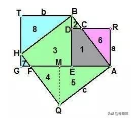 设直角三角形两直角边的长分别为a、b(b>a),斜边的长为c. 做三个边长分别为a、b、c的正方形,把它们拼成如图所示形状,使A、E、G三点在一条直线上. 用数字表示面积的编号(如图).