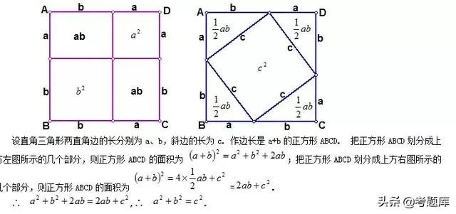 从图上可以看到,这两个正方形的边长都是a + b,所以面积相等. 即a的平方加b的平方,加4乘以二分之一ab等于c的平方,加4乘以二分之一ab,整理得a的平方加b的平方等于c的平方。