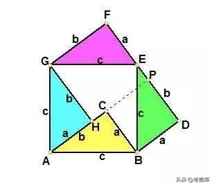 做四个全等的直角三角形,设它们的两条直角边长分别为a、b ,斜边长为c. 把它们拼成如图那样的一个多边形,使D、E、F在一条直线上. 过C作AC的延长线交DF于点P.