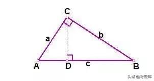 如图,在RtΔABC中,设直角边AC、BC的长度分别为a、b,斜边AB的长为c,过点C作CD⊥AB,垂足是D.