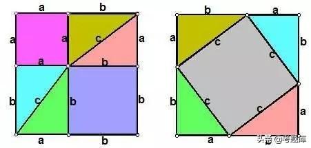 做8个全等的直角三角形,设它们的两条直角边长分别为a、b,斜边长为c,再做三个边长分别为a、b、c的正方形,把它们像上图那样拼成两个正方形.
