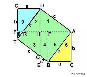 做两个全等的直角三角形,设它们的两条直角边长分别为a、b(b>a),斜边长为c. 再做一个边长为c的正方形. 把它们拼成如图所示的多边形. 过A作AF⊥AC,AF交GT于F,AF交DT于R. 过B作BP⊥AF,垂足为P. 过D作DE与CB的延长线垂直,垂足为E,DE交AF于H.