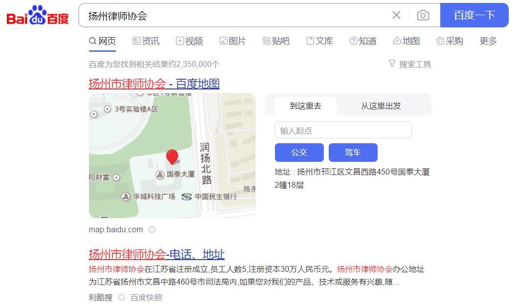 小编观察到,百度首页的扬州律师协会地址和扬州律师协会电话均未更新。