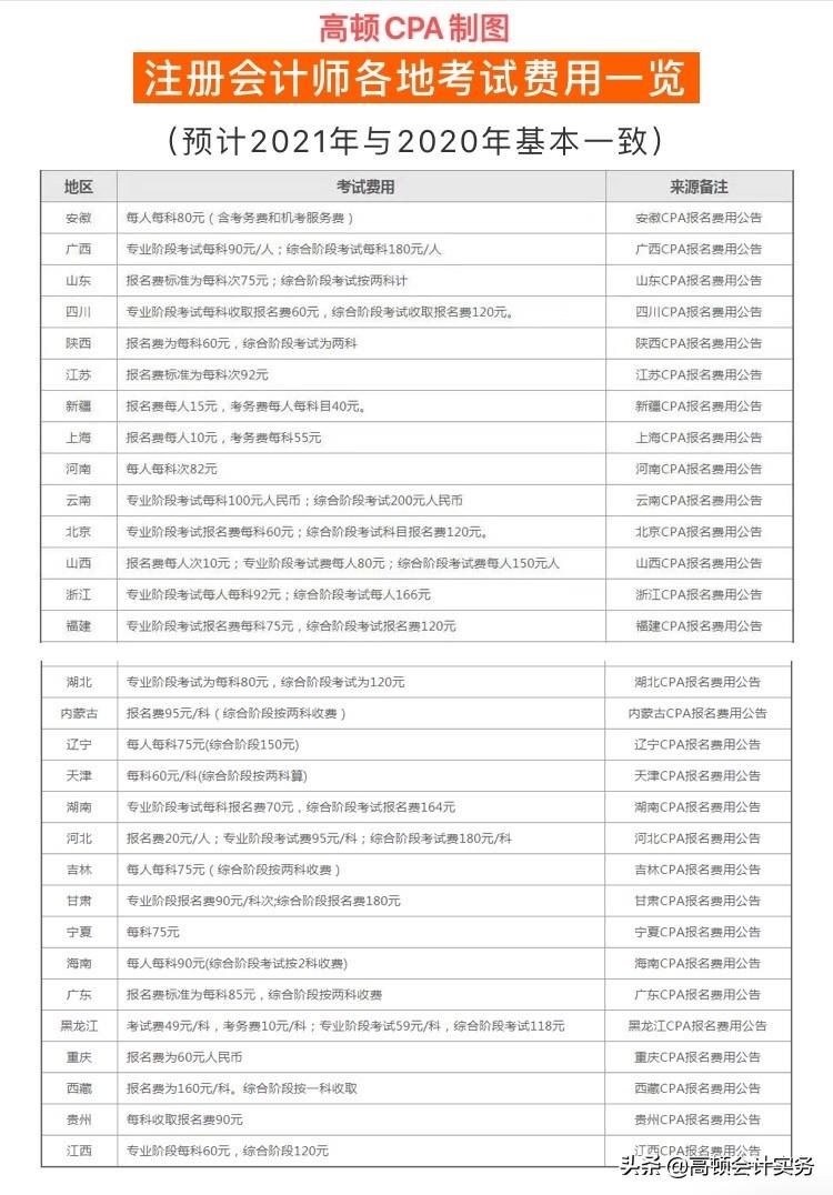2021年的各省报名费未曾公布,高顿CPA小编找来了2020年的报名费,给各位注会考生参考,下图为不同考区专业阶段报名费: