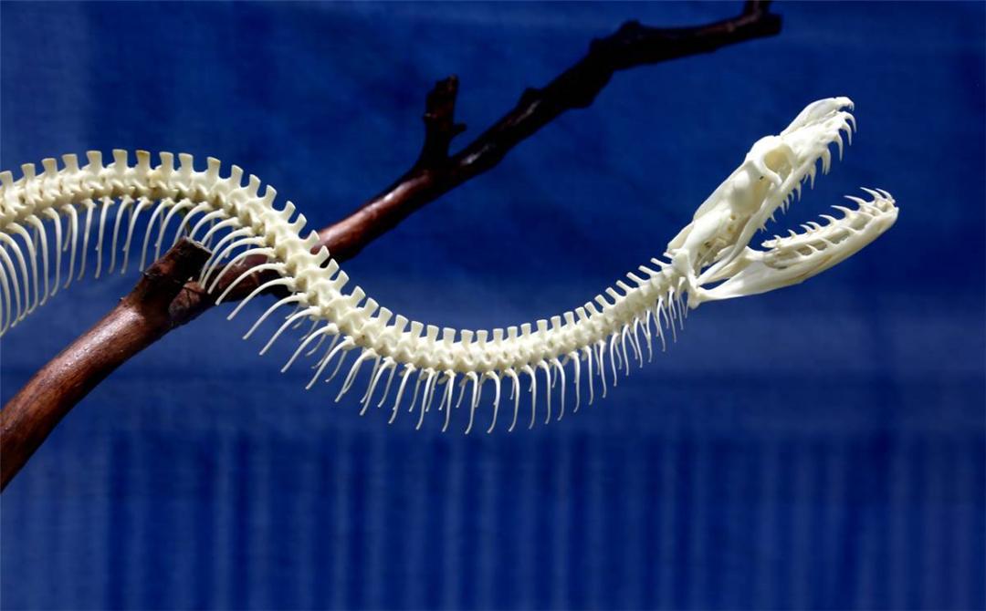 森蚺嘴巴开合角度大,上下可张到180度左右,4排牙齿能独立活动,再加上蛇皮可以拉伸,所以它能轻松吞下猎物,其中包括一些体型比它大的动物。