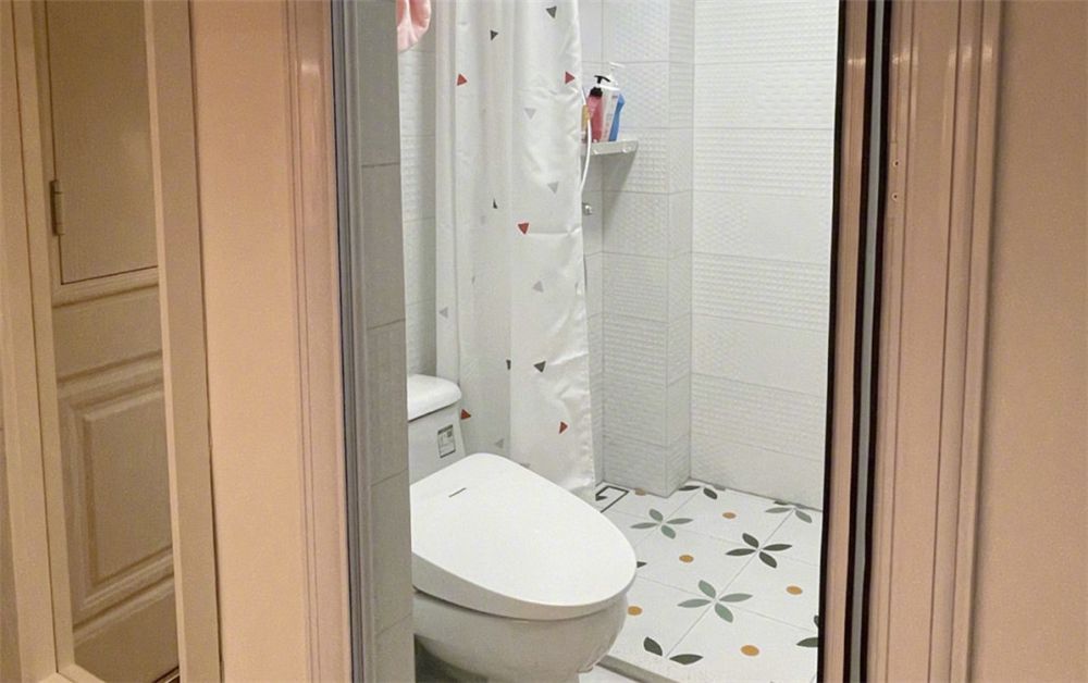 而改造后的卫生间,虽然空间依旧很小,但更换了地砖、墙面砖和照明,看上去温馨明亮,最主要的是,用浴帘简单分隔干湿区,打扫起来会更加轻松。