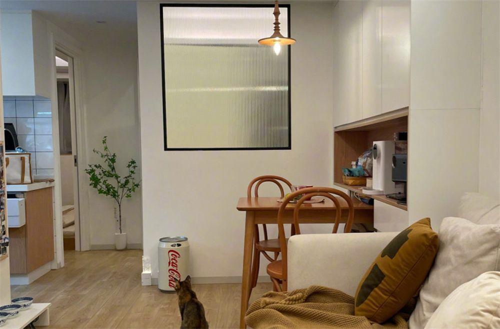 原本家里的客厅很暗,甚至并没有餐厅的位置,而这次改造过后,也在客厅的基础上,挤出了一个小小的双人位餐厅。