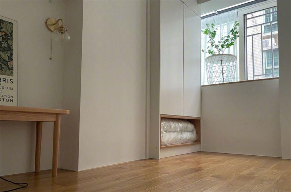 卧室里,原本靠墙的地方做了一组柜子,破旧不说,关键还占地儿,所以在改造的时候自然也将它进行了拆除。