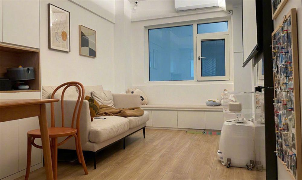 首先,夫妻俩将原本的窗扇换成双层夹胶玻璃,并且取消了屋外的防盗网,不仅看上去好看多了,保温隔热性能也强了很多。其次,墙面和地板采用白墙+木地板的经典搭配,在均匀的照明下,实在是有种非常温馨舒适的感觉。其余的家具也焕然一新,比如提升观影感受的投影、舒适的布艺沙发、满足收纳需求的通顶柜,这些都让小家生机勃勃。