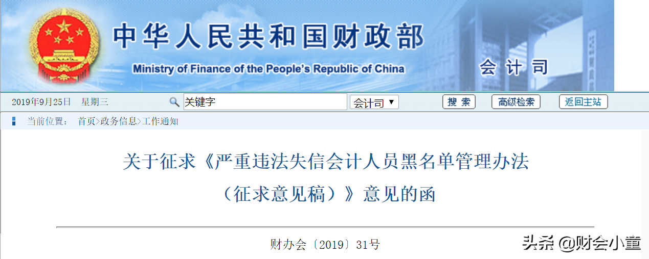 9月23日,财政部会计司发布《严重违法失信会计人员黑名单管理办法 (征求意见稿)》,在公开征集意见后,将正式修改定稿。