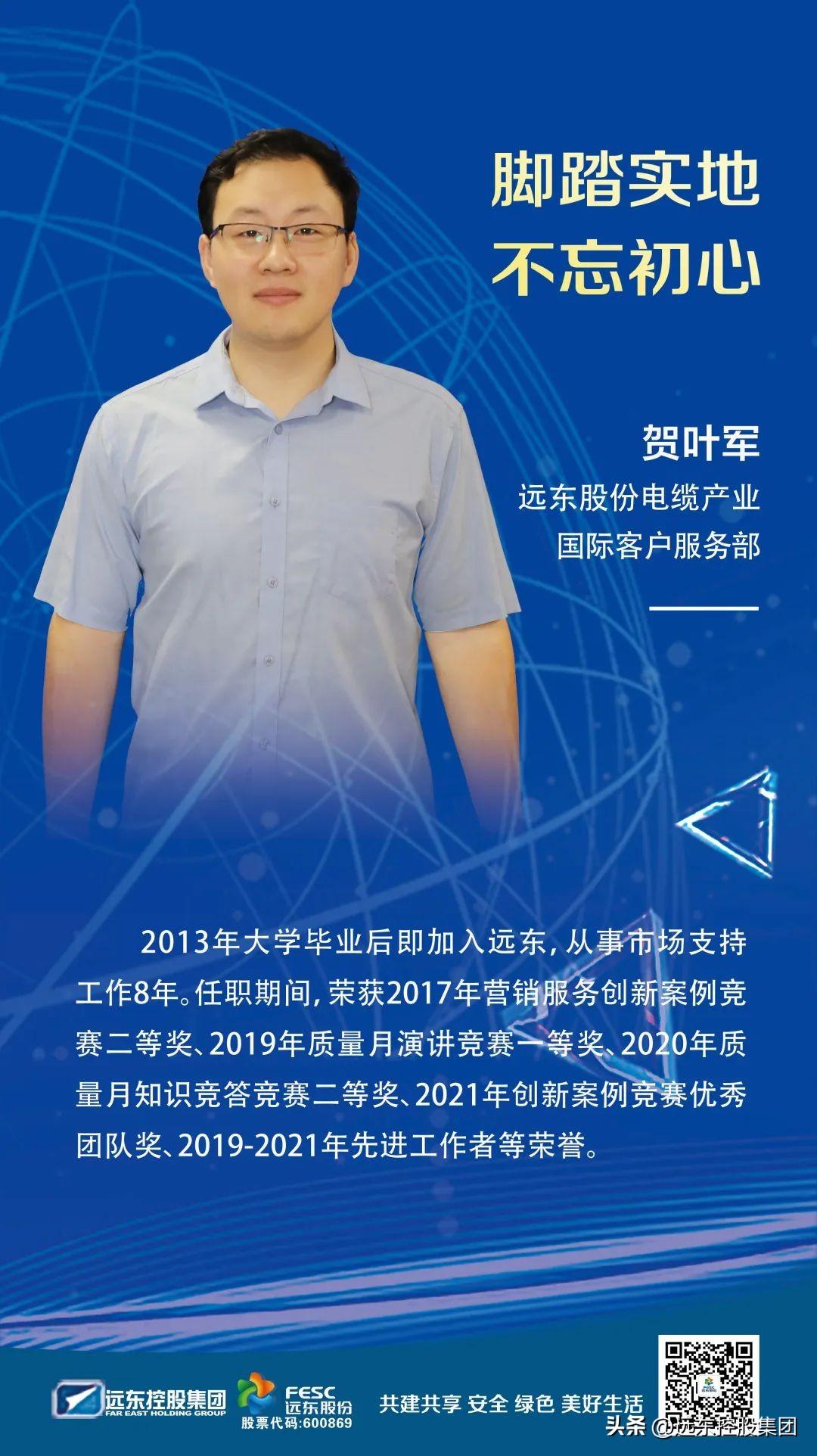 贺叶军,远东股份电缆产业国际客户服务部高级市场支持专员,2013年大学毕业后即加入远东,从事市场支持工作8年。任职期间,荣获2017年营销服务创新案例竞赛二等奖、2019年质量月演讲竞赛一等奖、2020年质量月知识竞答竞赛二等奖、2021年创新案例竞赛优秀团队奖、2019-2021年先进工作者等荣誉。工作中主动思考,积极负责,勇于创新,贡献突出,是名副其实的创新标兵。