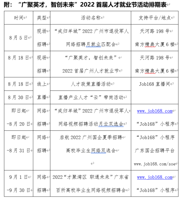 2022首届广州人才就业节由广州人才集团主办,广州人才集团配置中心(Job168.com)承办,以“广聚英才,智创未来”为主题,活动时间即日起至9月30日。系列活动共分为五大板块,包括最近最热人才政策话题直播、启航2022广州国企夏季招聘高校毕业生网络双选会、2022“才聚湾区 职通未来”广东省百所高校毕业生网络视频招聘会等精彩活动。