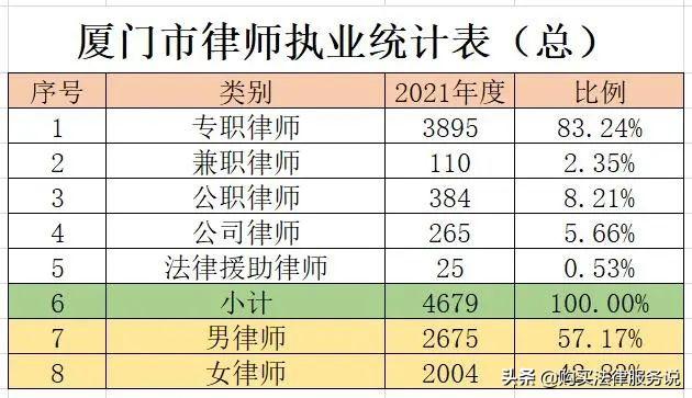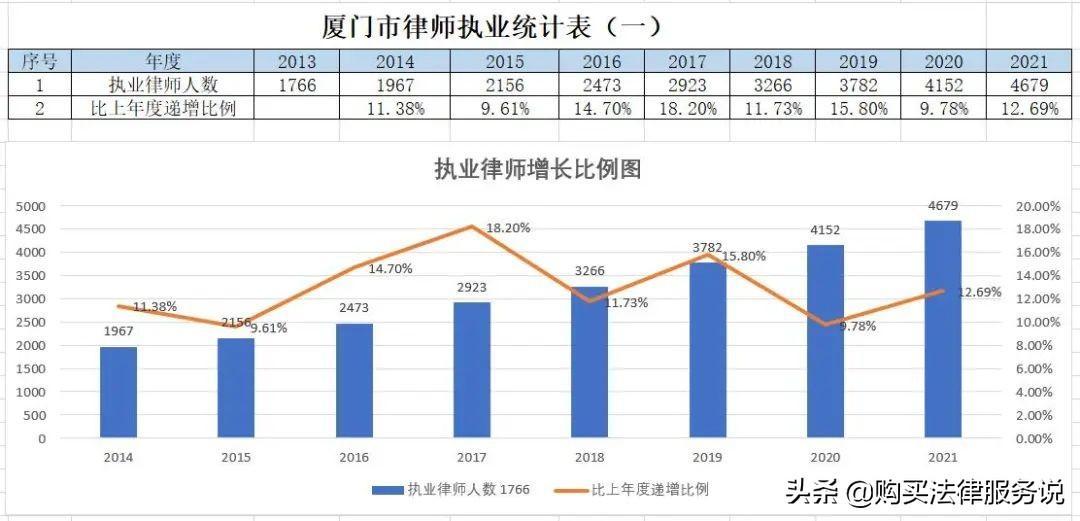 2021年度厦门共有各类律师4679名,近三年来平均每年增长12.76%。