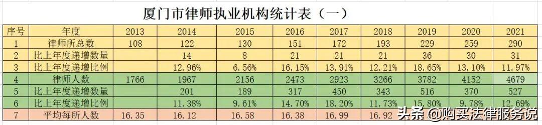 截至2021年底厦门共有律所290家。近三年来平均每所律师16.23名,连续多年保持平均数。律师所数量增长较快,平均每年增长32家,增幅14.57%。