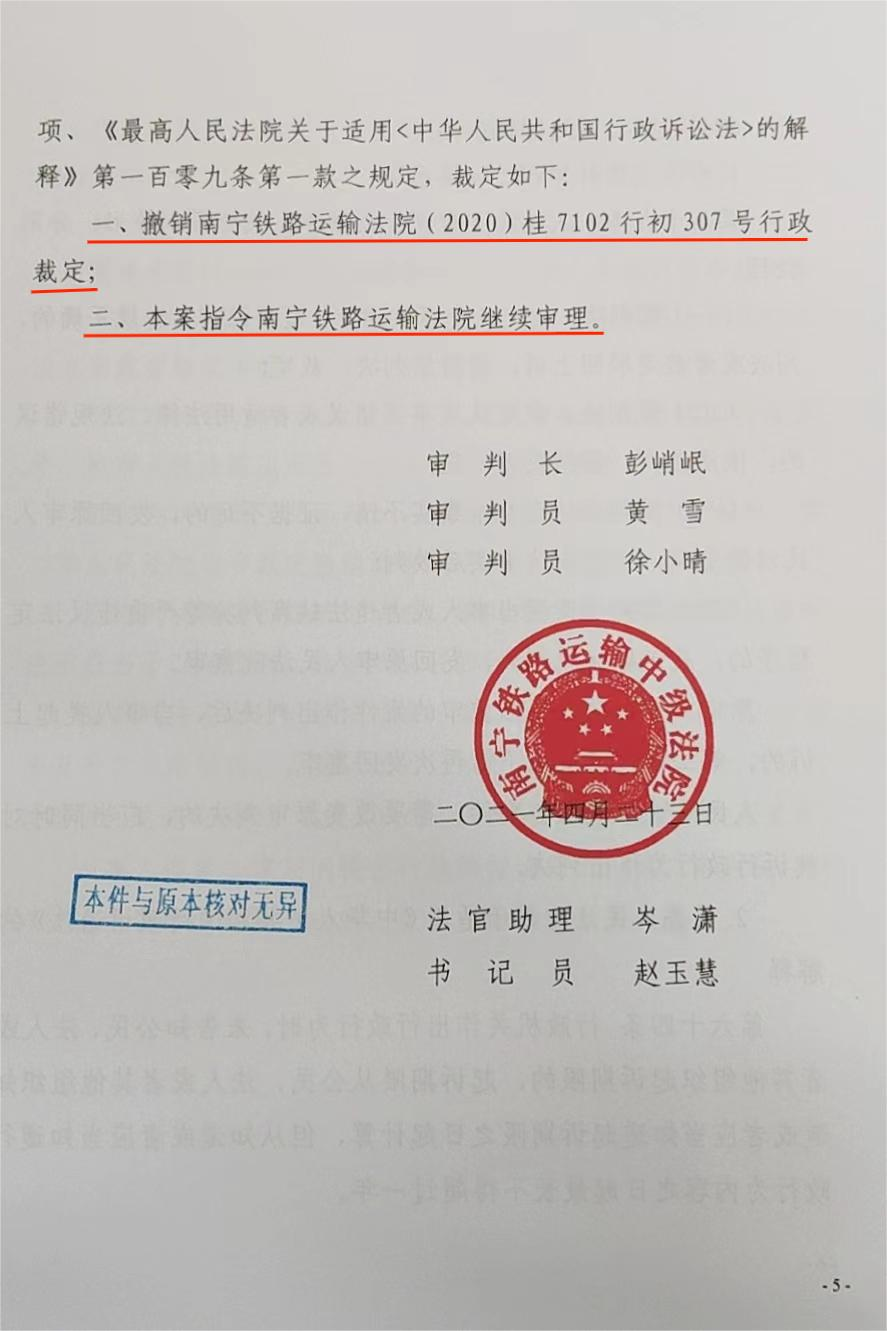 2021年4月23日,南宁铁路运输中级法院对本案作出裁定:撤销南宁铁路运输法院(2020)桂7102行初307号行政裁定;本案指令南宁铁路运输法院继续审理。