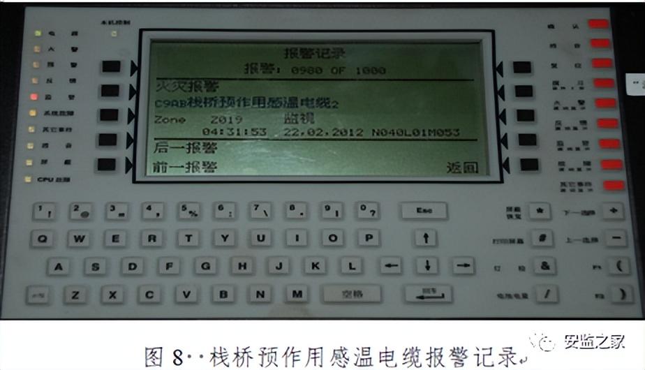 4、火灾报警装置存在设计缺陷(#8皮带拉紧装置到皮带尾部未设计安装感温电缆,存在死区),同时运行人员对火灾报警重视不够。经调取消防监控记录,着火期间#8皮带感温电缆均未起作用,装置未发出报警信号;事发当天3:41和3:48,当#8皮带头部和中部的烟感探头动作并发出报警信号时(集控室火灾报警监控盘),集控运行人员未发现和确认。