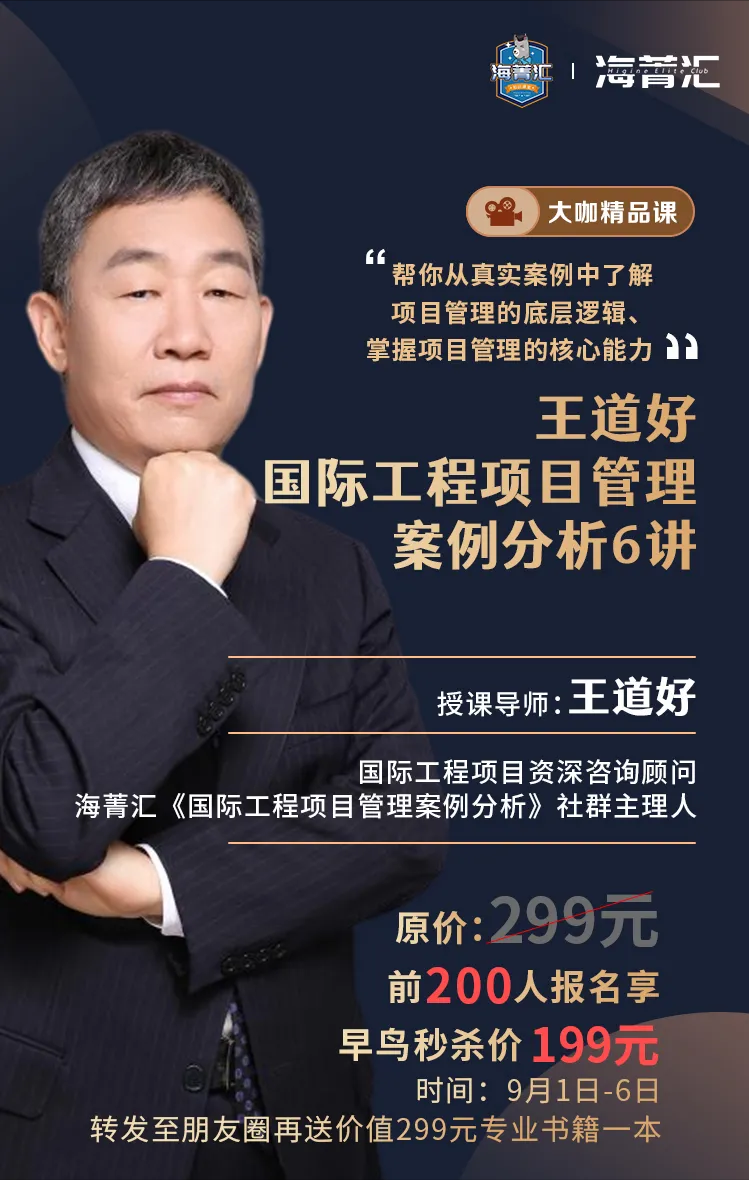 针对这一难点,海菁汇特邀拥有20多年项目管理一线经验的王道好老师,倾力打造6节国际工程项目管理案例课程,通过多个生动案例,深入浅出地解析,带你掌握国际工程在建项目管理的实操知识。