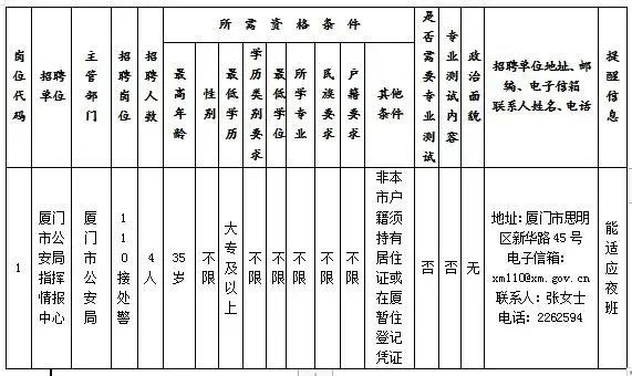 本次招聘非在编工作人员4名,从事110接处警(辅助)岗位。