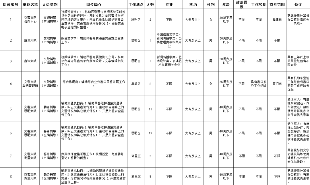 厦门市公安局拟面向社会公开招聘警务辅助人员47名。