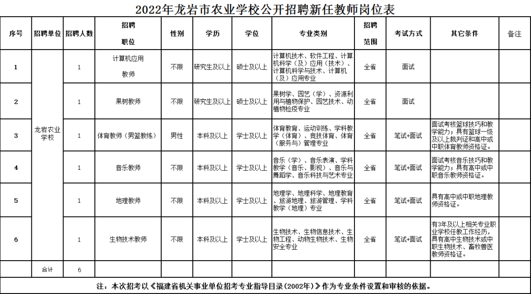 龙岩市农业学校创办于1942年,是福建省办学历史最悠久的农校之一,系国家级重点中等职业学校(财政核拨事业单位)。为进一步充实教师队伍,逐步改善教师队伍结构,促进学校事业发展,拟面向社会公开招聘新任教师6名,根据《事业单位公开招聘人员暂行规定》《龙岩市市属事业单位公开招聘工作人员暂行办法》等规定,制定具体方案如下: