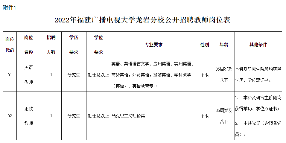 本次公开招聘岗位为福建广播电视大学龙岩分校事业编制专业教师2名,详见《2022年福建广播电视大学龙岩分校公开招聘教师岗位表》(附件1)。