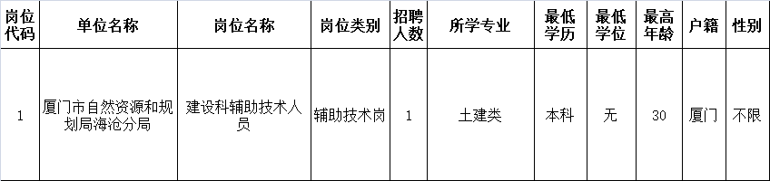 因工作需要,厦门市自然资源和规划局海沧分局拟面向社会公开招聘技术辅助岗位1名。