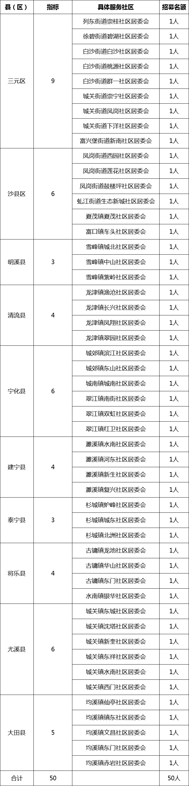 今年省上下达三明市统一招募高校毕业生服务社区计划50名,安排到纳入县级基本财力保障范围的县(区)的城市社区从事社区工作,服务期限为2年。根据三明市的实际情况,招募名额安排:三元区9名,明溪县、泰宁县各3名,清流县、建宁县、将乐县各4名,大田县5名,沙县区、宁化县、尤溪县各6名(详见附件1)。