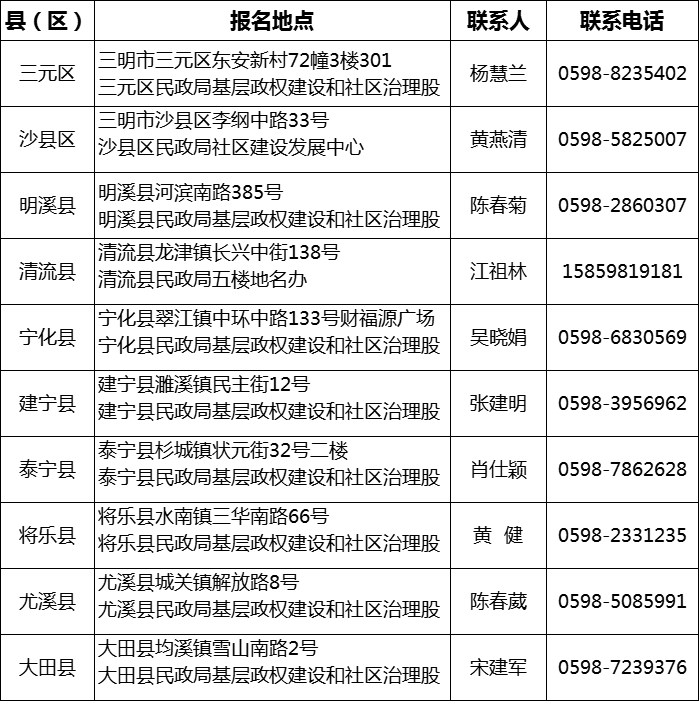 (1)现场报名。报名地点:三元、大田等10个县(区)民政局基层政权建设和社区治理股。