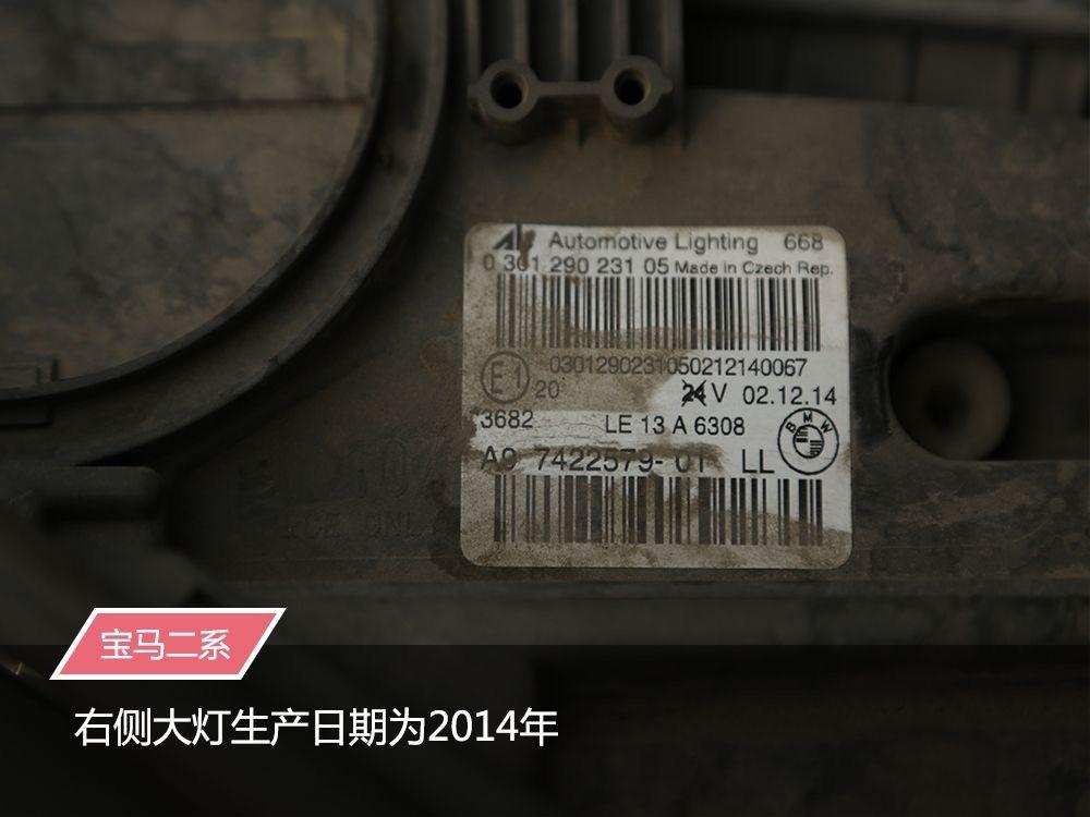 拆掉水箱上饰板,检查大灯螺丝是否有过拆卸,以及左右大灯上面的生产日期,车辆前部受到撞击的时候,最先损坏的就是大灯,即使后换原厂的大灯都达不到原车大灯的质量和耐久度,透过上饰板的缝隙检查水箱和冷凝器是否平行且笔直,一般受过撞击的话两者都会弯曲。