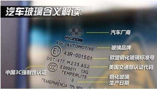 2、检查玻璃生产日期,大部分车辆的玻璃生产周期应该和车辆的生产周期一样或者接近,而对于玻璃生产周期的检查可以证明车辆两侧的ABC柱是否受过撞击,玻璃的生产日期看起来有点繁琐,汽车玻璃右下角数字和点的组合就代表玻璃的生产周期,数字表示生产年份,点代表具体的生产周期,点在数字左边表示玻璃是上半年生产,用七减去黑点数表示生产月份;点在数字右边表示下半年生产,用13减去黑点数表示生产月份,全车玻璃的生产日期都应该一样,如果有不一样的地方就要考虑这个部位是否受过伤。