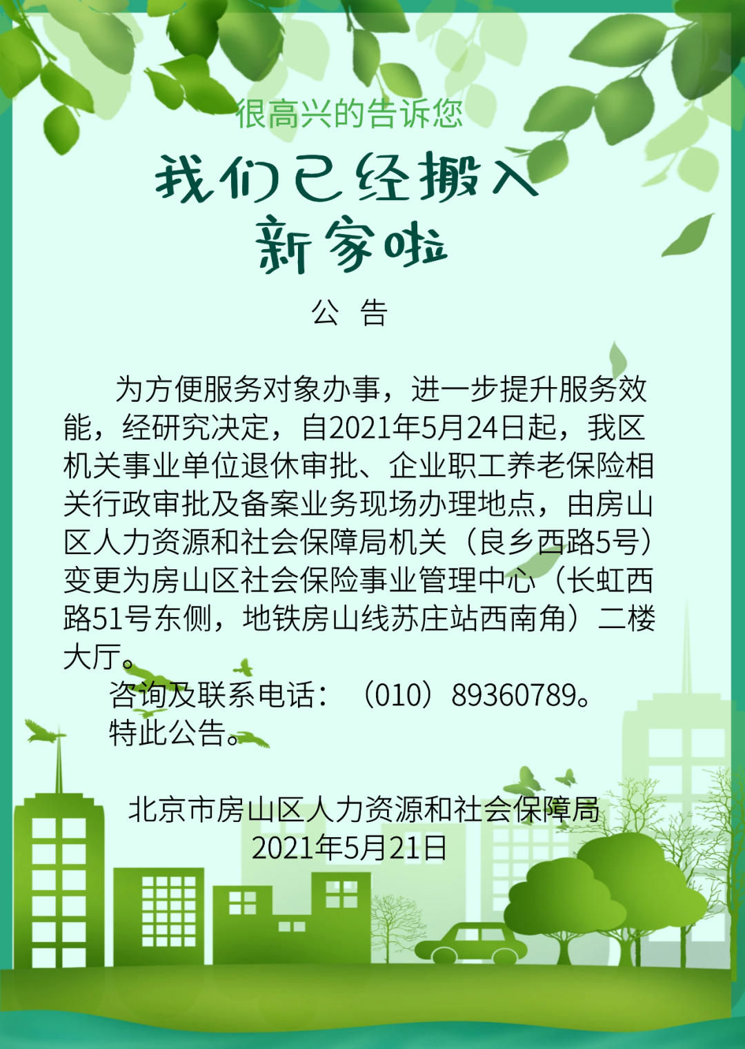 为方便服务对象办事,进一步提升服务效能,经研究决定,自2021年5月24日起,房山区机关事业单位退休审批、企业职工养老保险相关行政审批及备案业务现场办理地点,由房山区人力资源和社会保障局机关(良乡西路5号)变更为房山区社会保险事业管理中心(长虹西路51号东侧,地铁房山线苏庄站西南角)二楼大厅。