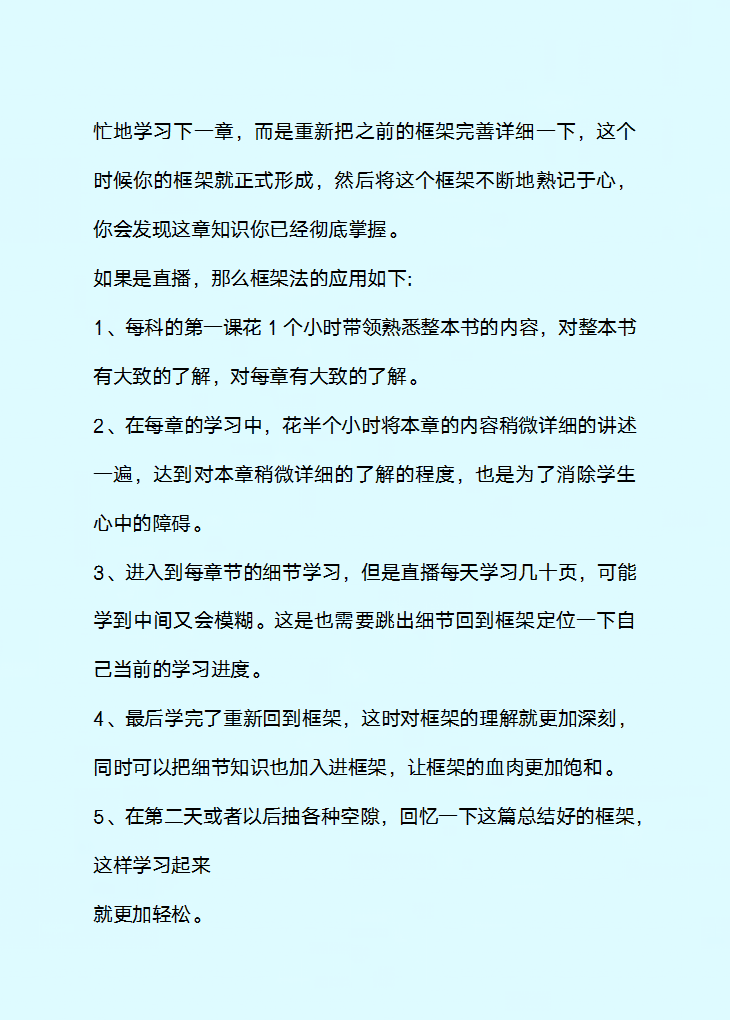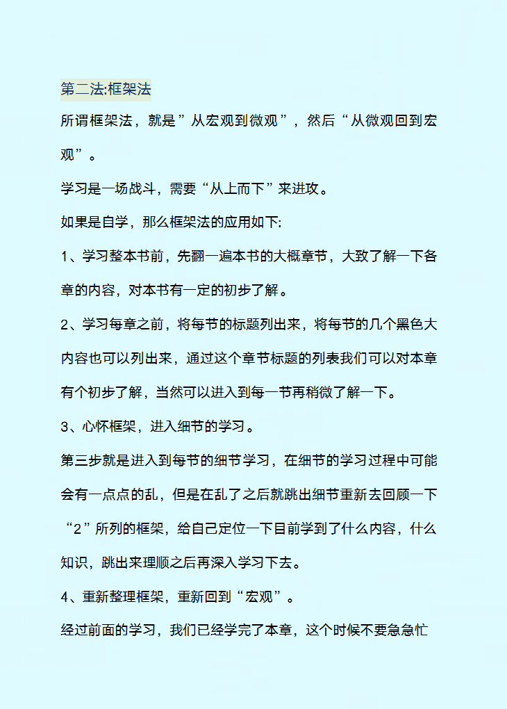 2、框架法:学习不是死学,每本书,每章节都有框架!心中有框架才能做到融会贯通!