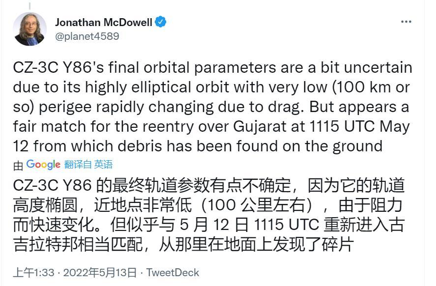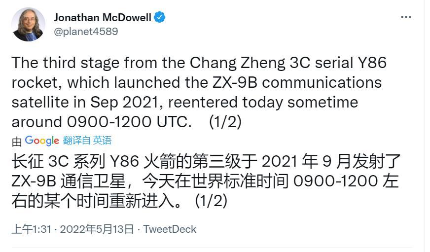 当大家都在纳闷这物体究竟是从哪来时,哈佛-史密森尼天体物理中心的太空观察员乔纳森麦克道尔(Jonathan McDowell)在5月13日发布了一条推特称这些残骸可能来自中国在2021年9月发射的ZX-9B通信卫星三级火箭或者上面级。