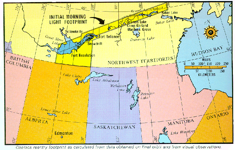 苏联科学家称已经全部解体,但事实上这颗卫星由于结构紧凑,反应堆等物件都没有完全烧毁,分布在了从大奴湖到贝克湖沿途600公里的加拿大领土上,该区域横跨西北地区,包括今天的努纳武特地区、阿尔伯塔省和萨斯喀彻温省。