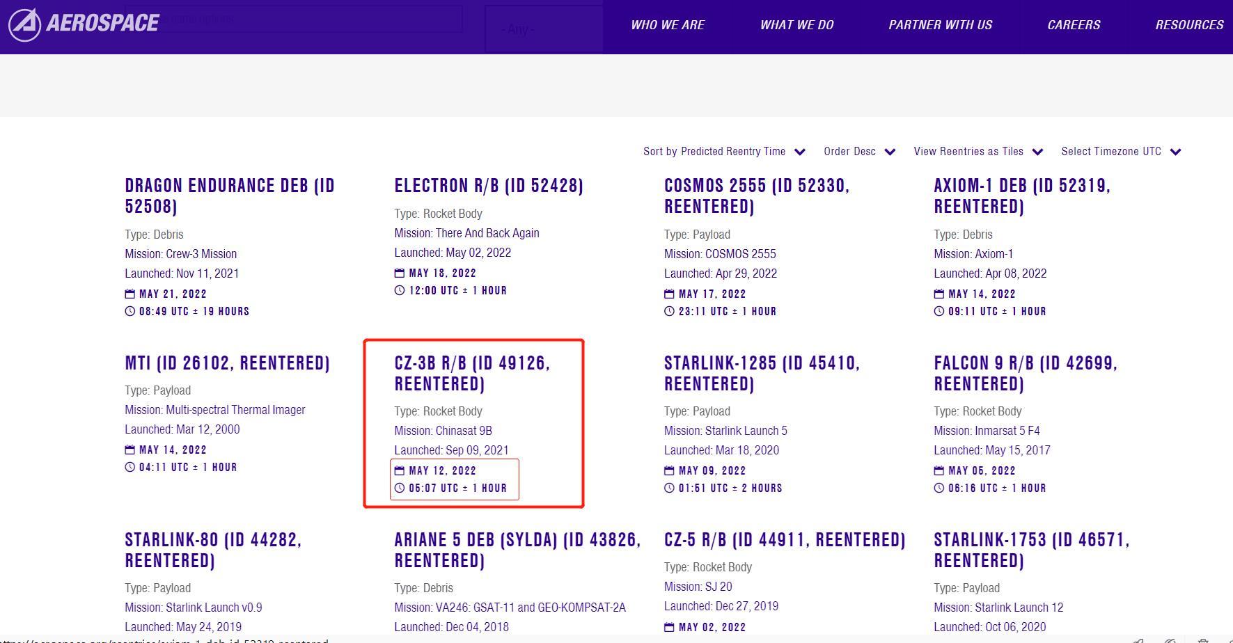 AeroSpace是一个轨道碎片跟踪与再入预告信息查询的网站,种花家查到了CZ-3B R/B的碎片已经于5月12日再入大气层,其具体信息为: