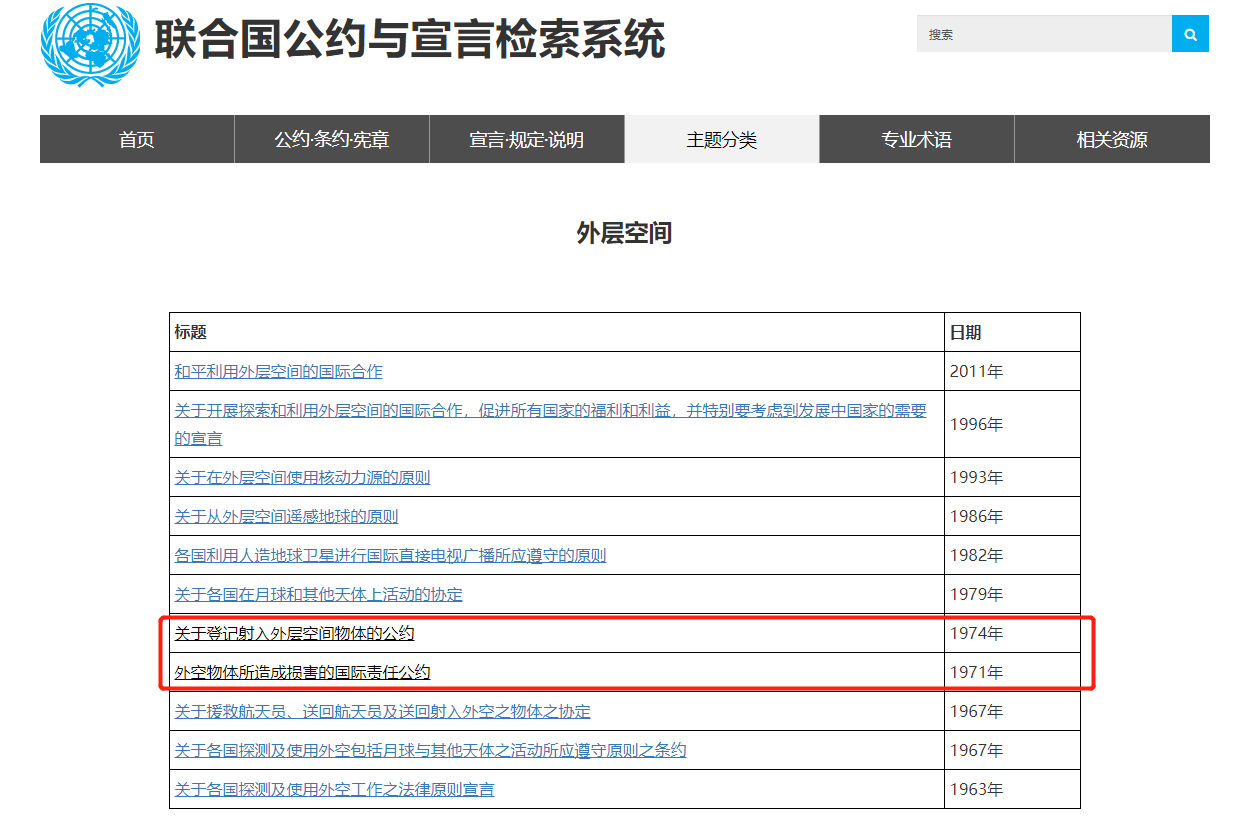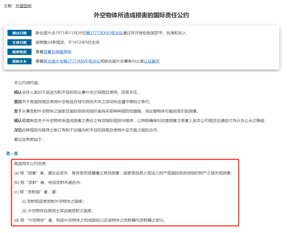 其中《关于登记射入外层空间物体的公约》是关于发射的飞船或者返回式航天器不慎落入他国时各国需要遵守的条约,包括协助搜索以及保全设备与归还等等,而《外空物体所造成损害的国际责任公约》指的就是各国发射的物体重返大气层造成损失时应该如何区分责任:
