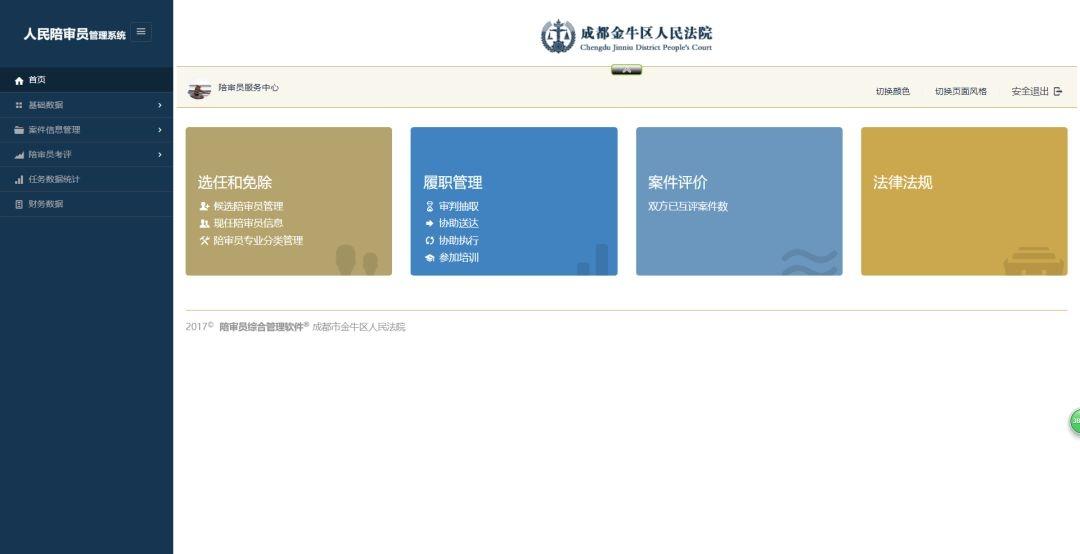 2016年,金牛区法院以科技为支撑,在原有的人民陪审员综合管理电脑系统基础上精心打造“金牛法院e陪审”,这是金牛区法院响应中央号召,顺应“互联网+”发展趋势,对保障陪审权利,扩大人民陪审员参审范围,建立客观公正高效的随机抽选机制的一项重要尝试。