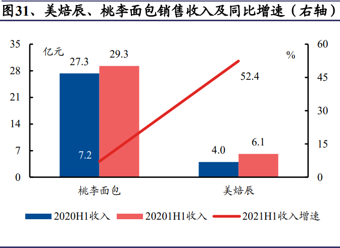 短保面包方面,桃李面包、美焙辰是目前国内唯二的全国性短保面包品牌, 2021H1 销售收入各为 29.3、6.1 亿元。1)、生产模式方面,二者均采用全国化 “中央工厂+批发”模式;截至 2021H1 末,美焙辰布局全国 18 个工厂,桃李面 包则在 20 个区域建立生产基地。2)、产品特点方面,二者均走平价路线,覆盖 主流面包品类。3)、经销方面,二者销售网络均遍布全国;美焙辰 2020 年末终 端数量约 13 万个,更多依托达利集团经销商资源进行分销;桃李面包 2021H1 末有逾 31 万个零售终端,注重直营,公司直接与大型连锁商超和中心城市的中 小超市、便利店终端签署销售协议。4)、销售区域方面,桃李面包起家于东北, 在东北和华北市场有优势,2021H1 两地销售收入各占 37.7%、19.5%;美焙辰各 大区销量较平均,单一地区占比均在 20%以下。