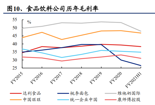 1)、毛利率:达利食品处于中等水平,长期内取决于产品结构,短期受原材料成本波动影响。横向对比来看,FY2021H1 各家公司毛利率为:东鹏饮料 (49.7%)>维他奶国际(47.9%)>中国旺旺(46.8%)>达利食品(38.3%)>桃 李面包(36.6%)>统一企业中国(34.8%)>康师傅控股(31.1%),主要由业务 品类决定,豆奶、能量饮料等业务毛利率较高,而方便面、面包糕点等业务毛利 率稍低;同期,达利食品的家庭消费(含豆奶、短保面包)、休闲食品(含烘焙 糕点、薯片、饼干)、即饮饮料(含能量饮料、凉茶)毛利率各为 44.5%、35.3%、 50.0%。纵向对比来看,达利食品毛利率波动受其产品结构变动和原材料成本影 响。小麦、大豆、食糖、棕榈油在达利食品原材料采购额中位列前四,2020 年 以来小麦、大豆、棕榈油价格上涨给公司毛利率带来负面影响;而功能饮料等高 毛利产品占比提升则对毛利率产生拉动作用。