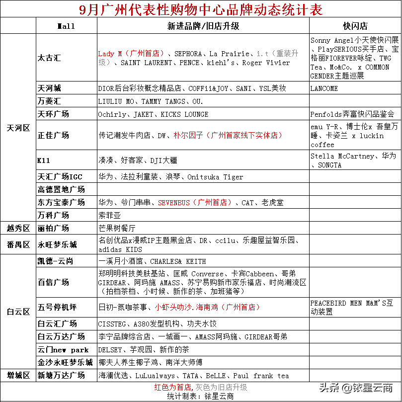 9月广州20个购物中心调改品牌68家,其中包括LadyM、朴尔因子、SEVENBUS、小虾头叻沙.海南鸡四家广州首店;