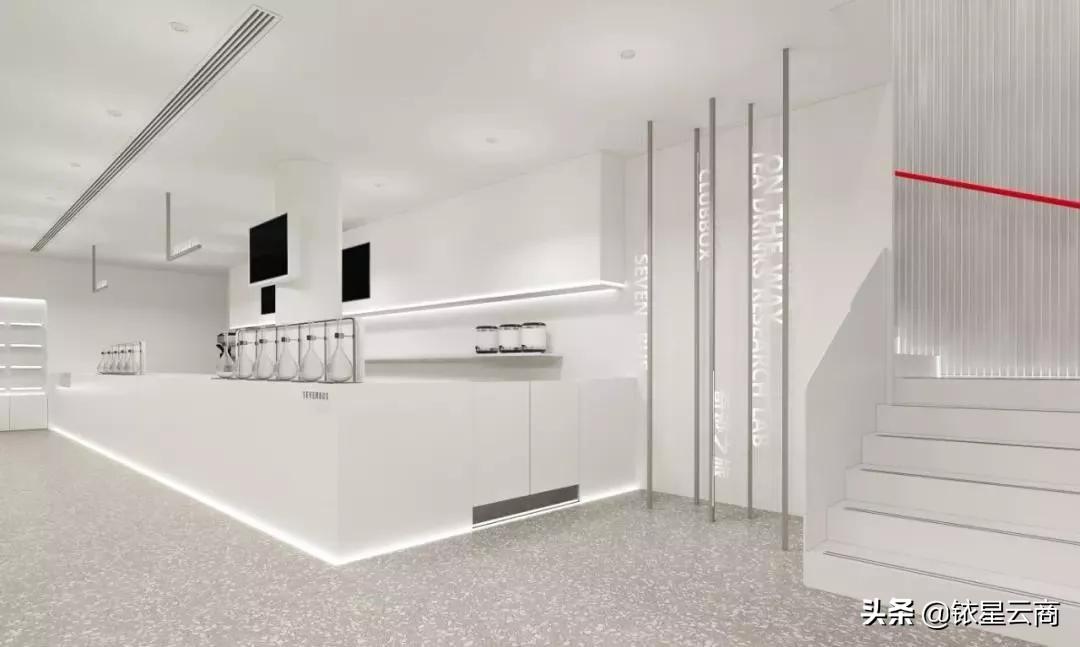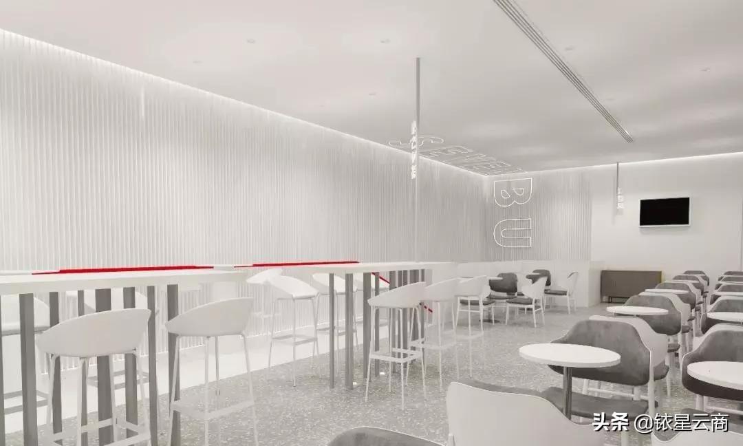 纯白色空间+超宽落地玻璃,只有在品牌的位置才露出一抹鲜艳的红色,而延续以灰白红为主色调,鲜果区、制茶区、提货区错落有致地布置。