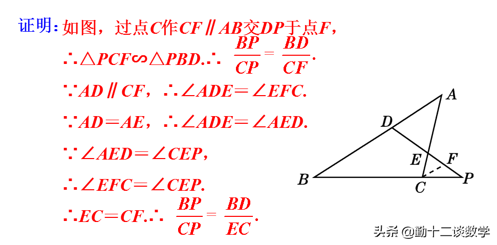 方法二:过点B作BF∥AC交PD延长线于点F.则△PCE∽△PBF,所以该相似三角形的对应边成比例,即BFCE=BPCP.根据平行线的性质,等腰三角形的性质以及对顶角的定义得BF=BD.则BFCE=BDCE,故BP:CP=BD:CE.