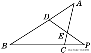 例题3:如图,在△ABC中,AB>AC,在边AB上取一点D,在AC上取一点E,使AD=AE,直线DE和BC的延长线交于点P.求证:BP:CP=BD:CE.