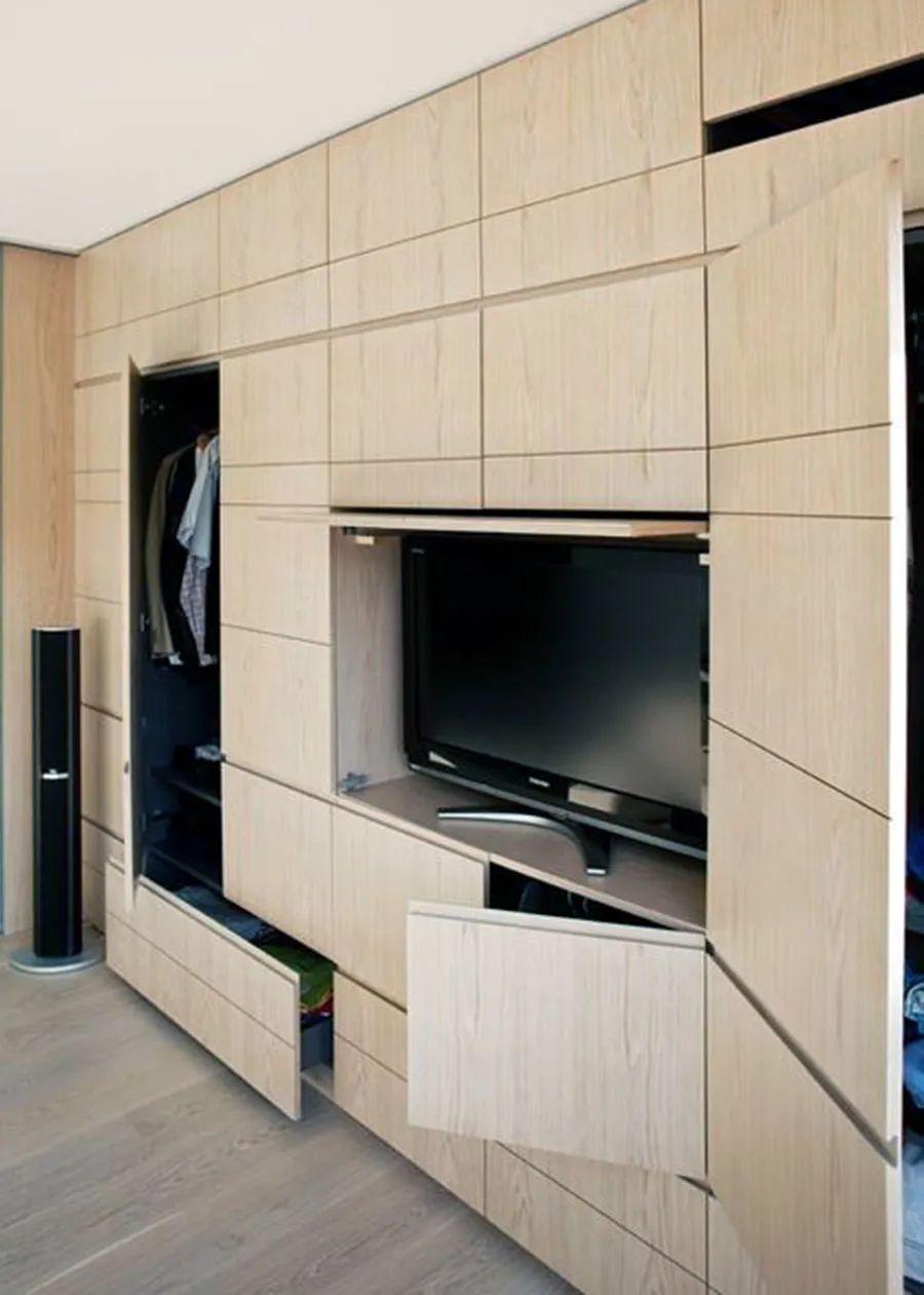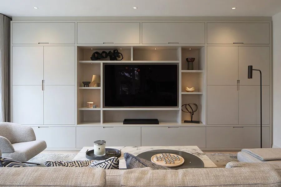 建议,电视墙柜可结合门板设计,达到隐藏效果。其次,若是客厅空间较小,电视壁柜底部则可采用悬空设计,或是局部采取类似"壁龛"的设计,减缓压迫感。