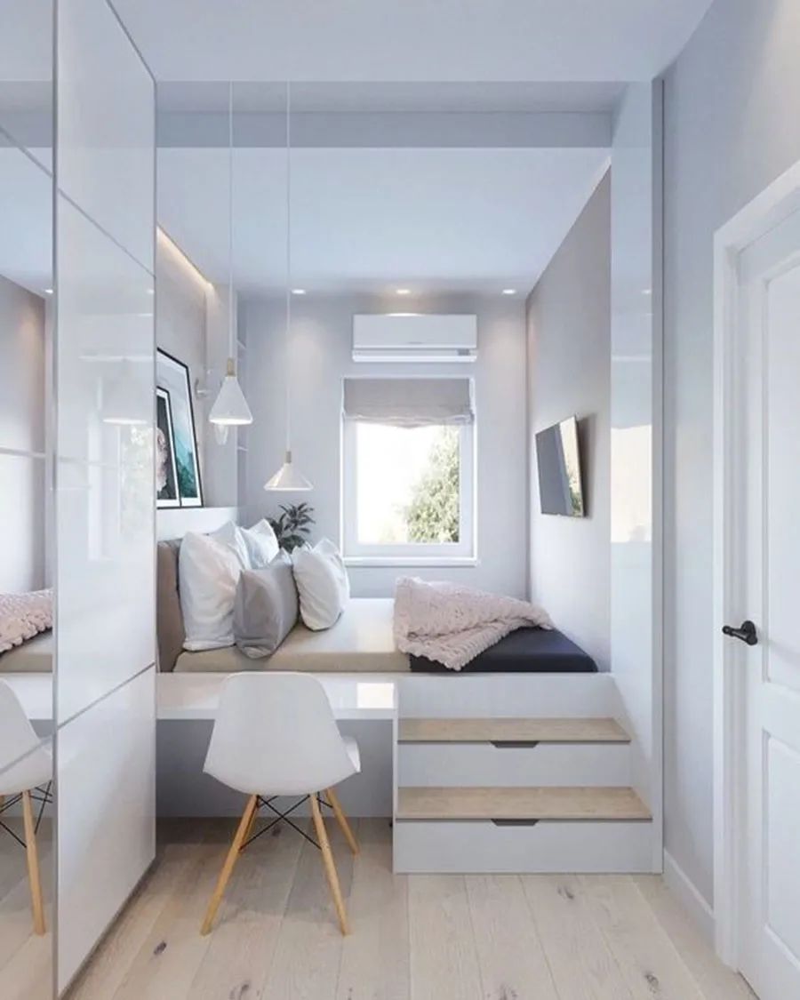 将地台加高也是很常见的装修手法,作为安装地暖、管线或打造置物空间之用。常规来说,加高的高度不超过50厘米,但为了提升小型卧室的实用性,建议将地台高度增加至1米(以上)。