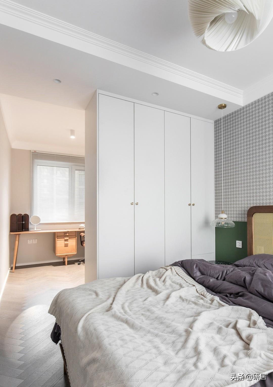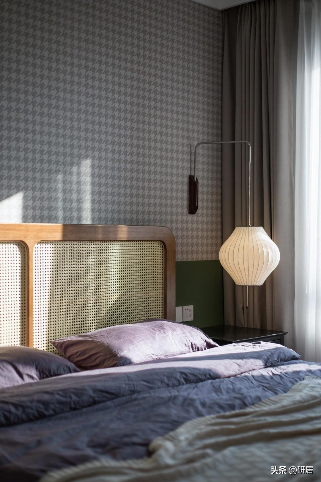 格纹墙布、绿色半墙、原木色藤编床,这些组合在一起,就有了现在的简约、雅致的画面,每一个小细节都透露着两人对生活的高品质追求与浪漫。