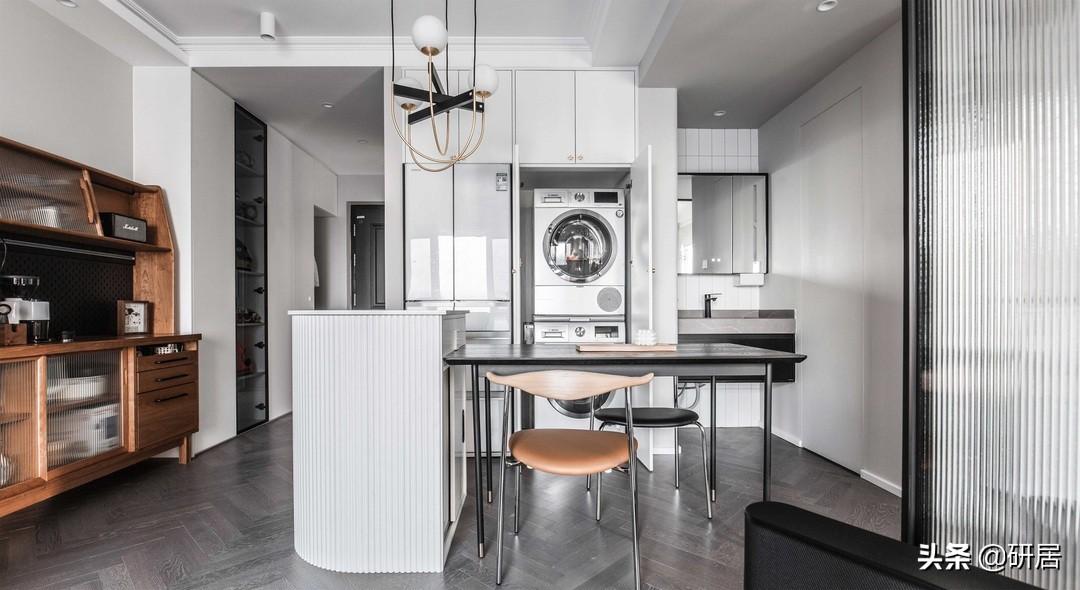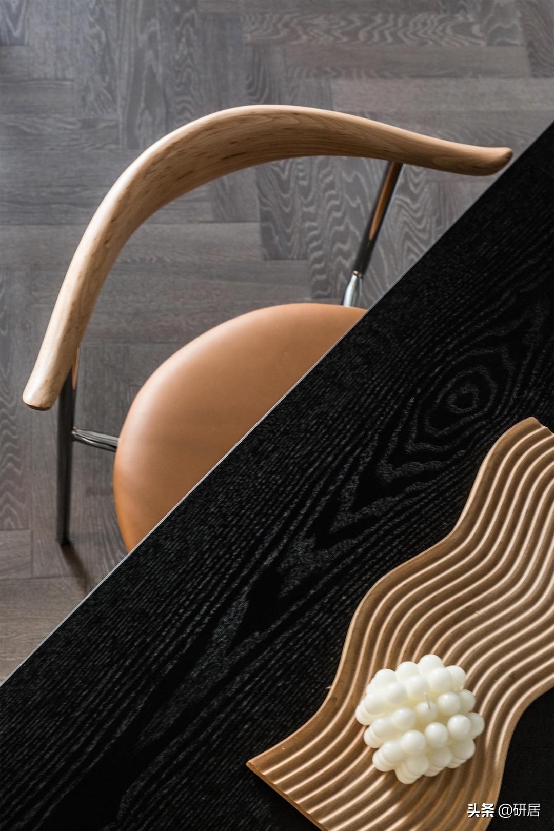 没错,相信大多数人都被这个半弧形岛台给吸引,利用弧形可以充分利用空间,而且带来优雅的感觉,紧靠它摆放黑色木纹实木桌拼接,就奠定餐厅整个气质,质感高级,简约大方。
