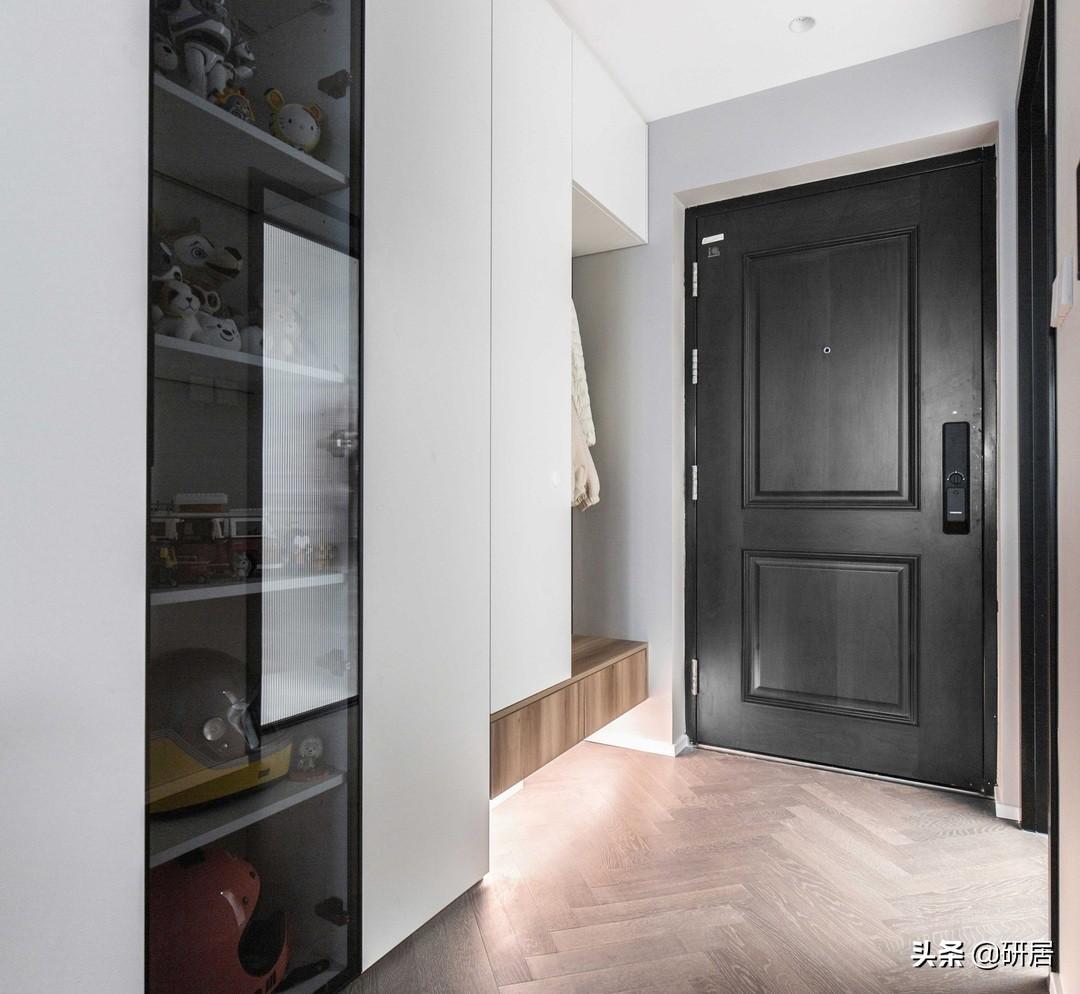在收纳上也做到了极致合理,双色木质柜体里收纳的是鞋子,极简的柜门关上后,看不见里面杂乱的鞋子。而玻璃部分收纳的是手办以及头盔,同时还充当了展示功能,一进家门心生欢喜。如果你家的玄关也不大,想要一种被“放大”的感觉,真可以学这样来设计。