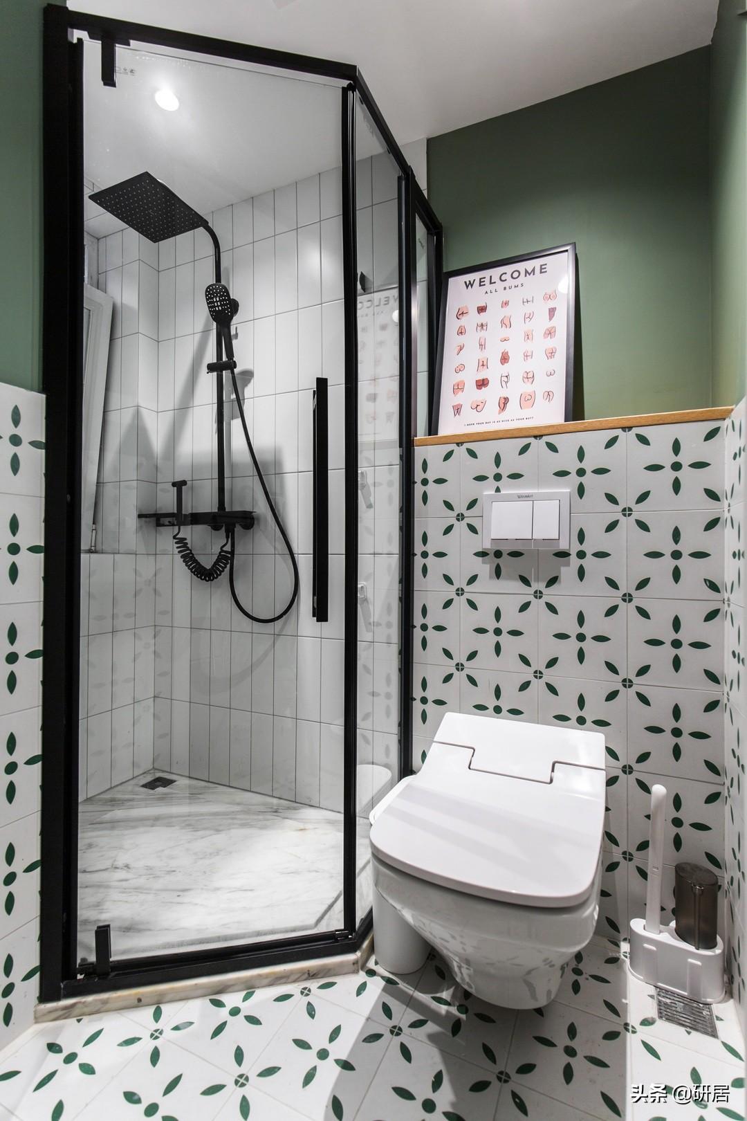 淋浴区用了隐形门,它的优点就是最大程度保持了统一性,进入后就是一个复古的空间,经过白绿色的撞色,带来不俗的时尚效果。